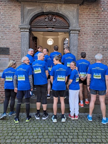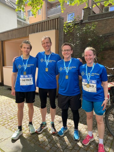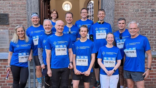 Treffpunkt Berger Kirche hieß es vor und nach dem Düsseldorfer Marathon für die Läufer*innen der drei Kirchenkreis-Staffeln. Organisatorin Christine Senftleben verteilte das Equipment, Pfarrer Peter Krogull erteilte den Läufersegen und die Kirchenkreis-Teams begleiteten die drei Startläufer zum Joseph-Beuys-Ufer. Um 10.15 Uhr fiel der Startschuss für 1156 Staffeln beim Düsseldorfer Marathon. Die drei Kirchenkreis-Staffeln gehörten zu den 782 angemeldeten Mixed-Teams. Mit dabei waren in diesem Jahr neben Peter Krogull, Leiter der Seelsorge-Fortbildung, Mitarbeitende aus den Bereichen Presse und Jugend sowie Ehrenamtliche. Drei Frauen und neun Männer liefen bei sommerlichen Temperaturen Teilstrecken zwischen 8,9 und 12,8 Kilometern. Jede Staffel legte zusammen die Marathonstrecke von 42,195 Kilometer zurück. Die schnellste Kirchenkreis-Staffel kam als Nummer 57 durch das Ziel, darauf folgten die Plätze 392 und 669. Das Motto der kirchlichen Teams lautete passend zu blauem Himmel und Sonnenschein „Laufen – einfach himmlisch!“. Und weil es so schön war, sind alle im kommenden Jahr wieder am Start.