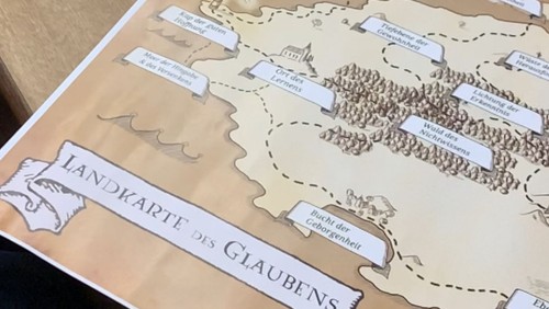 Um diese „Freudenfunken“ aufzuspüren, hatte die Synode Pfarrer Dr. Holger Pyka eingeladen, Dozent am Wuppertaler Predigerseminar für pastorale Ausbildung. Mitgebracht hatte er „Landkarten des Glaubens“ anhand derer sich die Synodalen in kleinen Runden über ihre eigenen „evangelischen Lebensläufe“ und ihre Erfahrungen mit Kirche und Glaube austauschten. Mit Ortsnamen wie Zauber des Anfangs, Lichtung der Erkenntnis, Gebirge des Zweifels, Ort des Lernens oder Wüste der Herausforderung bot die Landkarte zahlreiche Anknüpfungspunkte für Gespräche. So konnten die Synodalen beispielsweise herausfinden, an welchem Ort sie sich aktuell befinden, welche Erlebnisse sie mit bestimmten Orten verknüpfen oder wo sie gerne mal (wieder) sein würden. Die Landkarte gab den Betrachtenden keine bestimmte Richtung vor, sondern regte vielmehr zur eigenen Entdeckung des Weges an.
