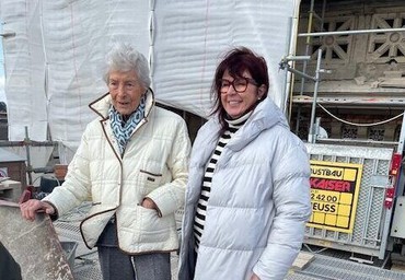 Spenderin Ute Huneke und Fundraiserin Andrea Gold in luftiger Höhe auf dem Dach der Johanneskirche Düsseldorf. Foto: evdus