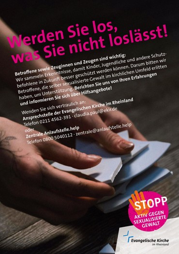 Zum aktiven Kampf gegen sexualisierte Gewalt gehört es auf allen Ebenen der Evangelischen Kirche im Rheinland, Betroffene zu ermutigen von ihren Erfahrungen zu berichten und ihnen Hilfe anzubieten. Als Kirche bitten wir auch Zeug*innen, ihre Beobachtungen, die möglicherweise auch schon lange zurückliegen, zu teilen. Dies kann ein Beitrag zur Aufarbeitung und zur Aufdeckung sexualisierter Gewalt sein und hilft uns, Menschen in Zukunft besser zu schützen.