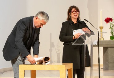 Stadtkirchenpfarrer Gert-Ulrich Brinkmann und Andrea Gold, im Kirchenkreis zuständig für Fundraising und Philanthropie, befüllten die Zeitkapsel mit verschiedenen Zeitzeugnissen. Ihren Platz in dem Gefäß fanden neben der aktuellen Tageszeitung auch Dokumente über die vielfältigen Angebote der Johanneskirche, etwas Geld sowie Briefe an die Nachkommenden.