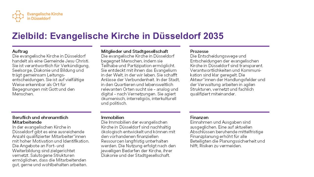 Als Arbeitsgrundlage für die Neuausrichtung unseres kirchlichen Handels hat die Synode im Frühjahr 2022 das Zielbild „Evangelische Kirche in Düsseldorf 2035“ vorgelegt, das konzeptionelle Aussagen zum evangelischen Leben in Düsseldorf enthält.